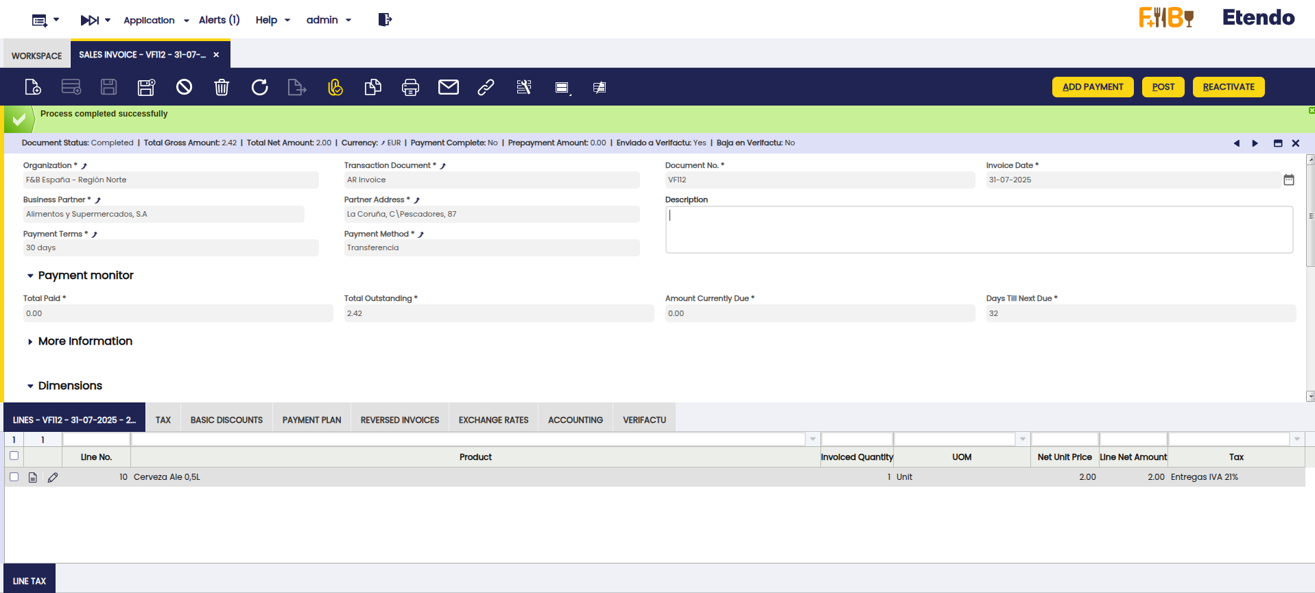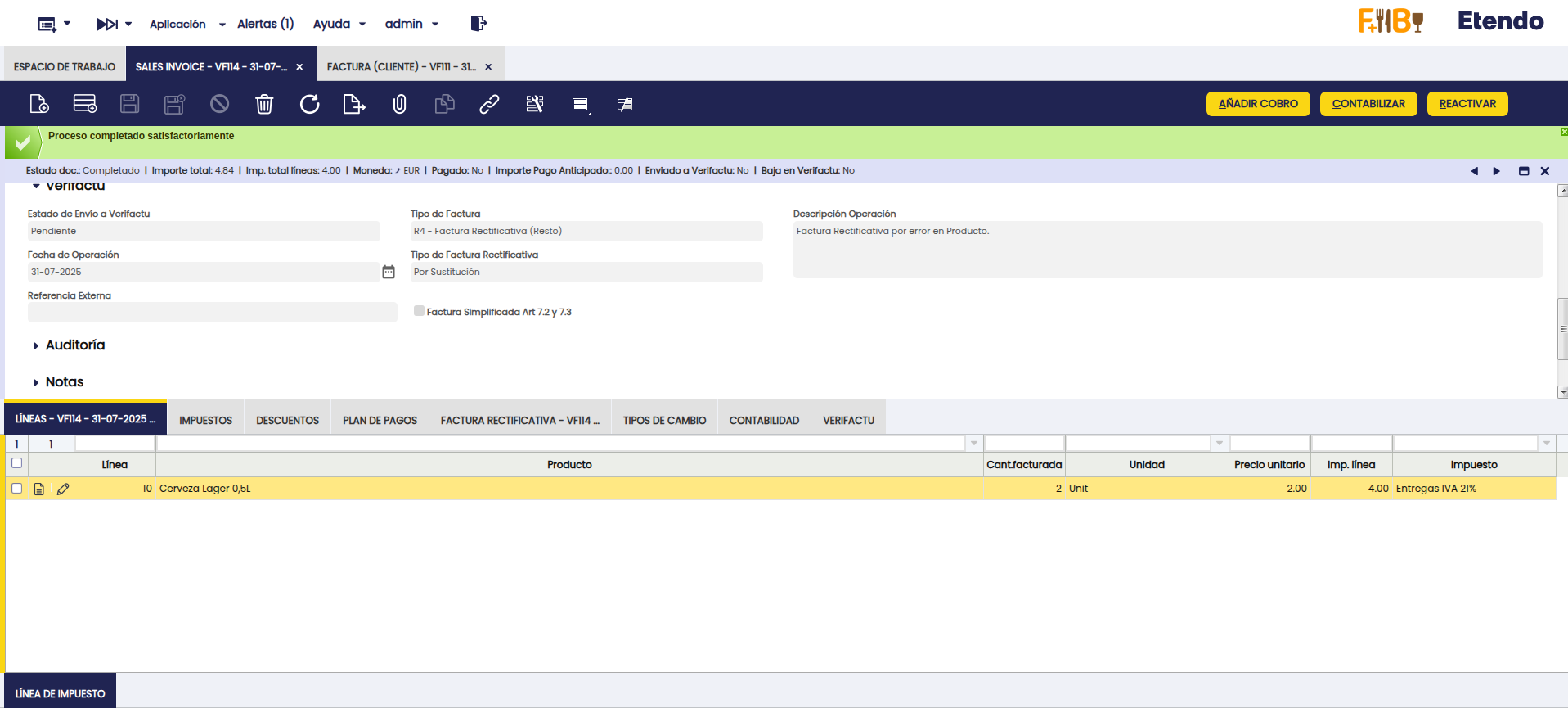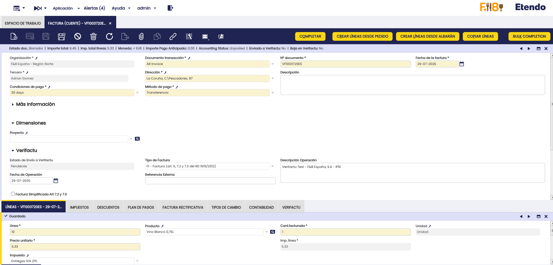 Con esta configuración, al generar la factura desde el pedido o la devolución, el sistema emitirá automáticamente una factura rectificativa, utilizando la configuración definida en el tipo de documento.