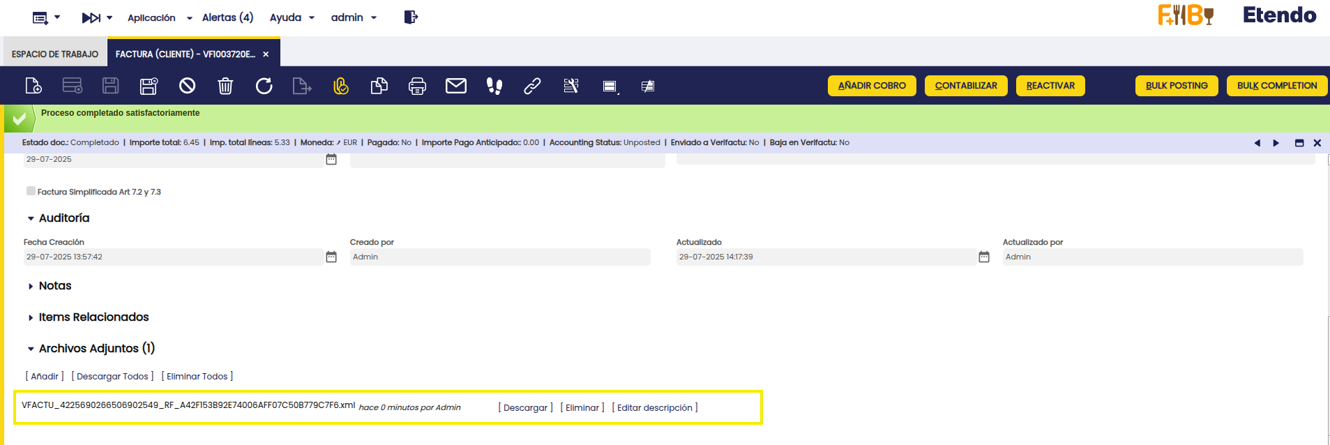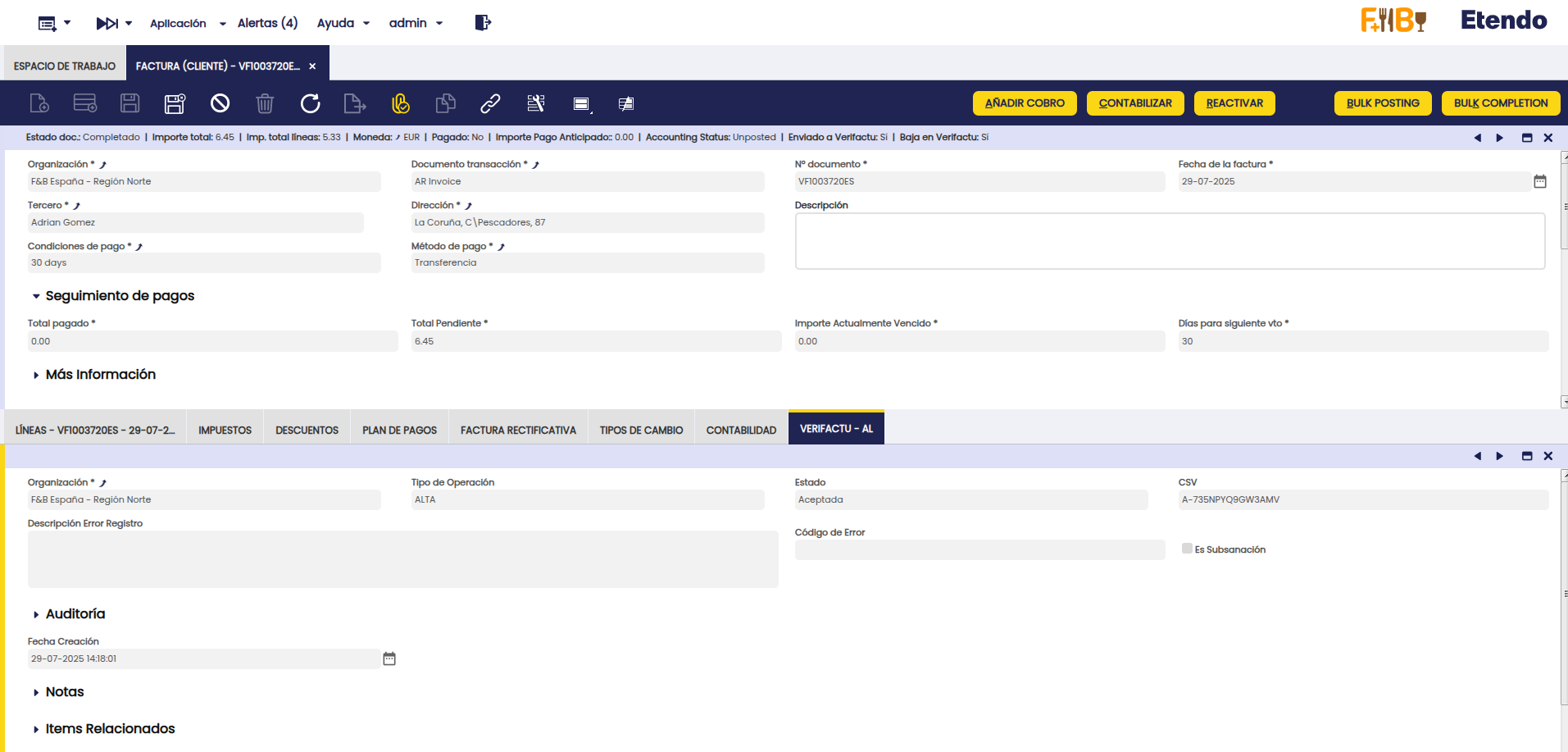 Este módulo permite a Etendo automatizar procesos clave como la generación, el registro estructurado y el envío electrónico de facturas, cumpliendo con los estándares de Verifactu. El sistema garantiza la inalterabilidad de los datos, la inclusión de códigos QR y la generación de eventos asociados, aportando total trazabilidad a cada operación registrada.