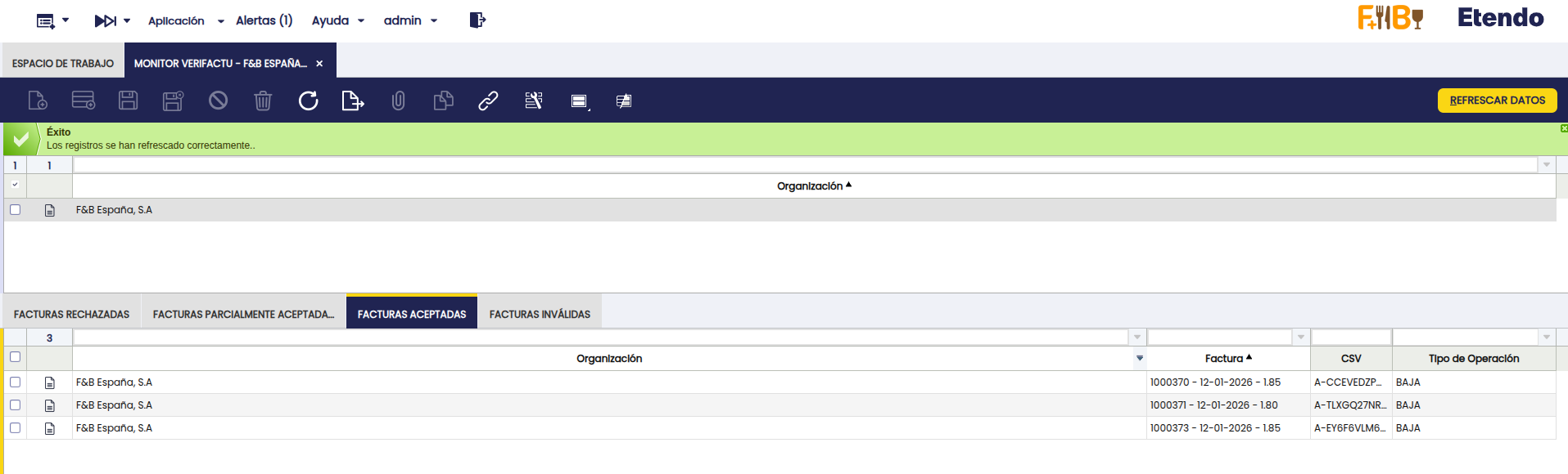 Permite consultar facturas en estado Rechazada, Parcialmente Aceptada, Aceptada e Inválida. Los tres primeros estados provienen de la AEAT; el último indica errores previos. Se debe pulsar Refrescar Datos para obtener los últimos registros.