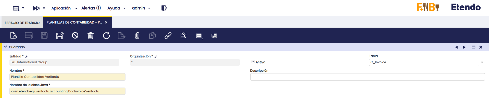 Si el sistema ya dispone de una plantilla de contabilidad, debe aplicar los cambios que tenía en su plantilla a la plantilla de contabilidad de Verifactu, ya que solo es posible tener configurada una única plantilla.
