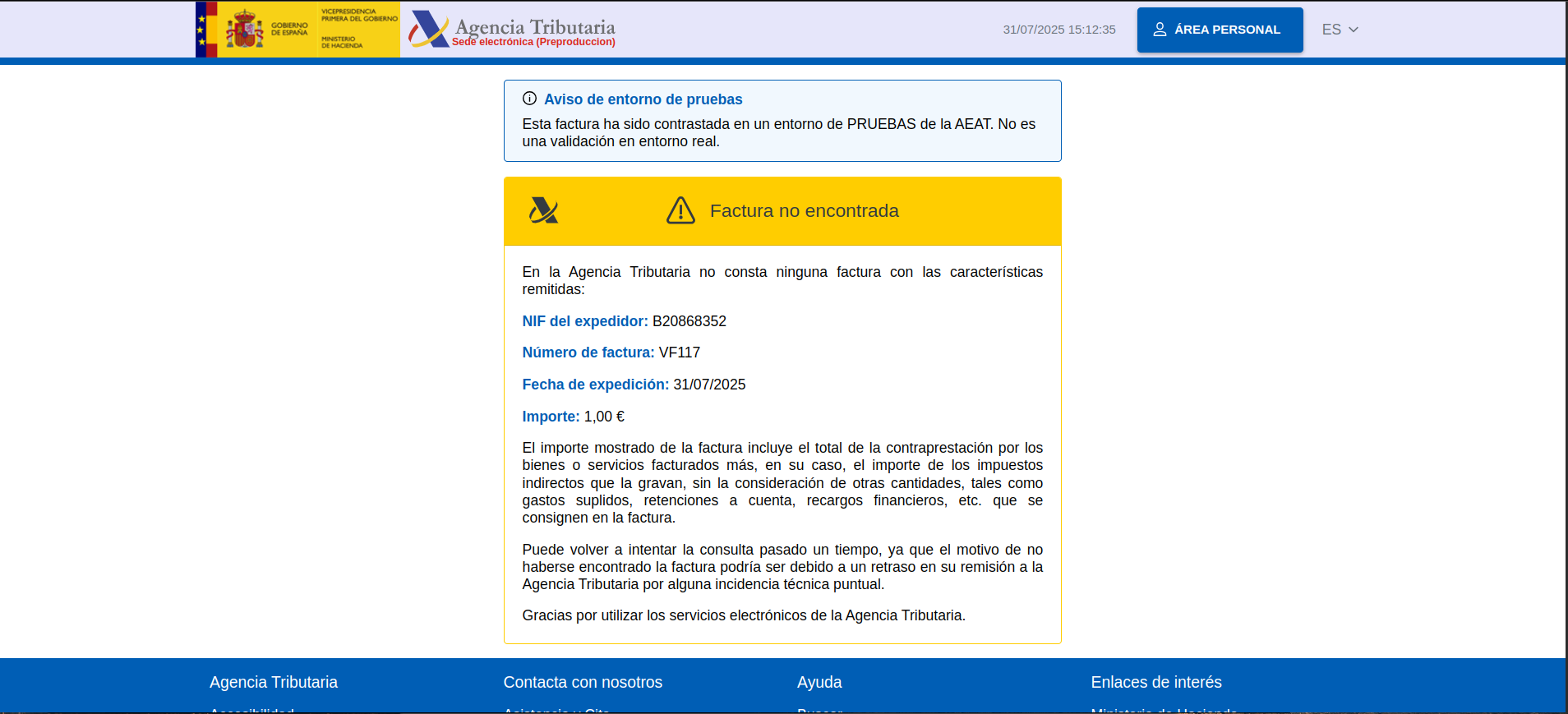 - Verificación por el receptor: permite comprobar si la factura ha sido efectivamente enviada a la AEAT a través del sistema Verifactu.