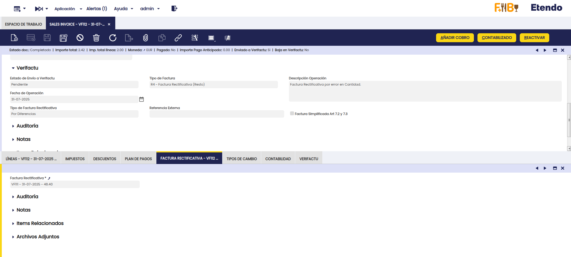Completar los campos de la sección Verifactu del documento indicando el tipo de rectificación que se usará.