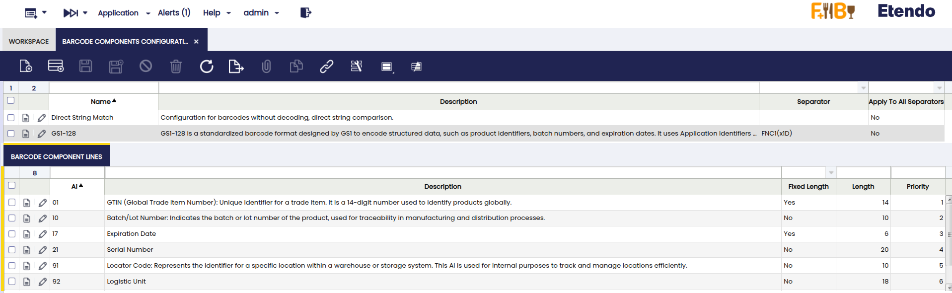 Barcode Components Configuration: A set of Application Identifiers defined by GS1 standards that are used in barcodes. That helps to distinguish different types of information. Each AI specifies the type of data that follows it, such as product identifiers (GTINs), lot numbers, expiration dates, or quantities.