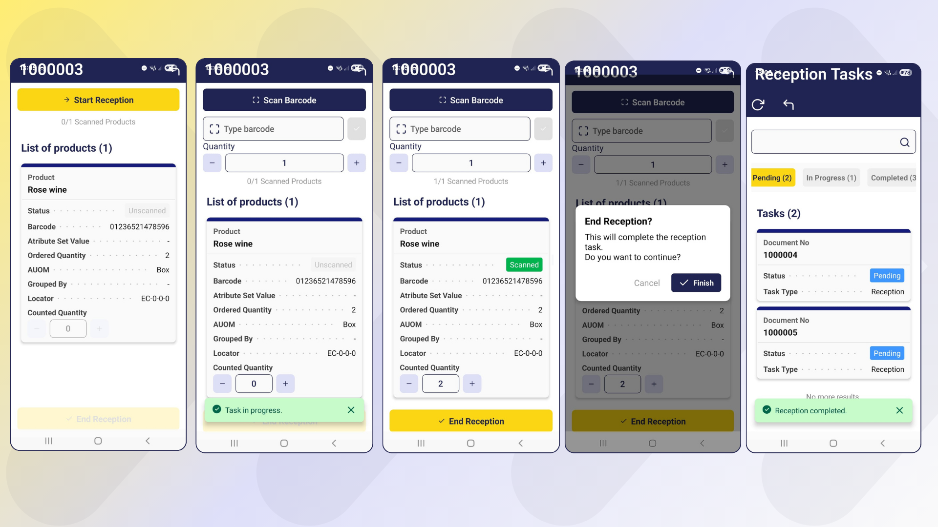 The process begins by clicking the Generate Receiving Task button in the Inbound Receipt window of the ERP. There, the task is assigned and then reflected in the mobile application of the assigned operator.