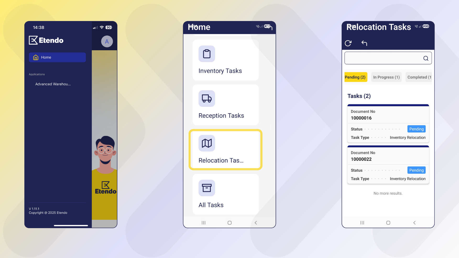 Two types of tasks have been added: Inventory Adjustment and Inventory Relocation. These tasks are created and assigned directly from Etendo and are available in Etendo Mobile from the Inventory Tasks menu for the operator to execute.
