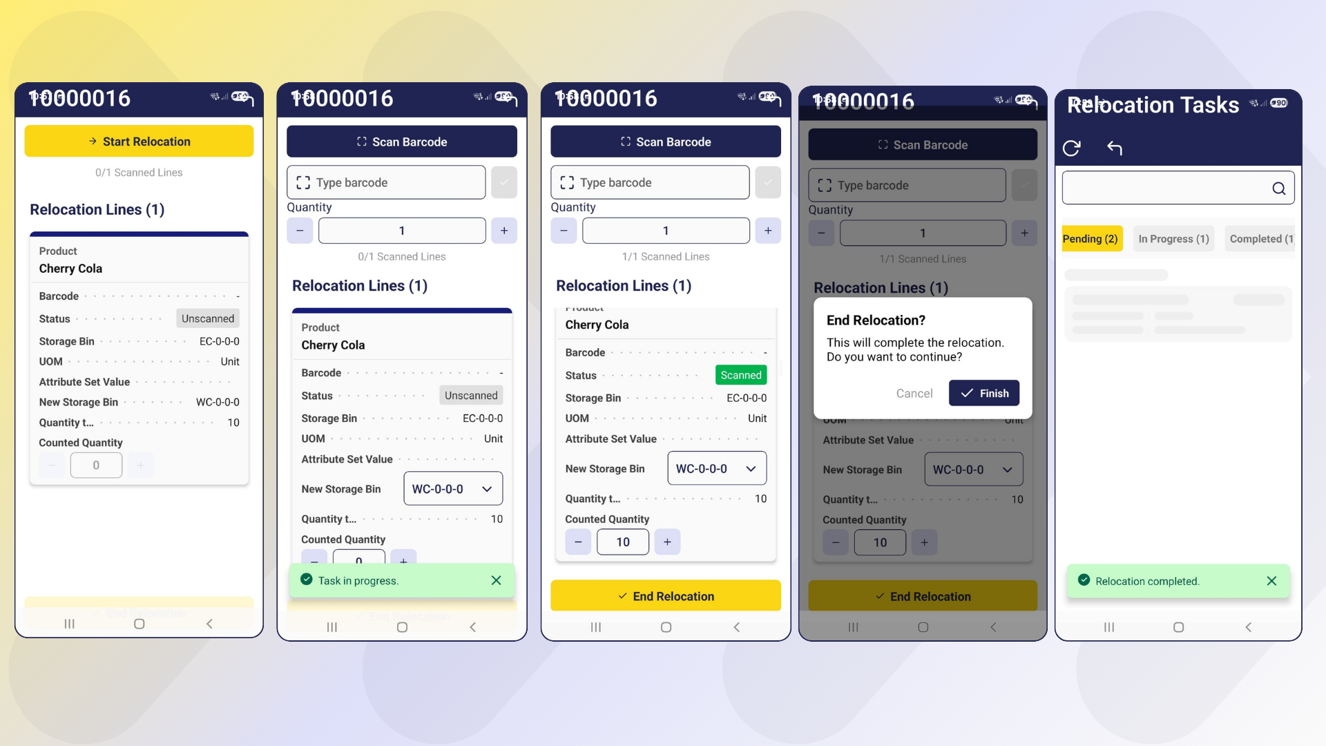 Relocation tasks allow products to be moved from their original location to their destination within the same warehouse. Each task is displayed in card format, where the quantity moved and the destination location can be confirmed or adjusted. The information entered is synchronized with the ERP at the end of the task, ensuring consistency between the recorded movement and the stock.
