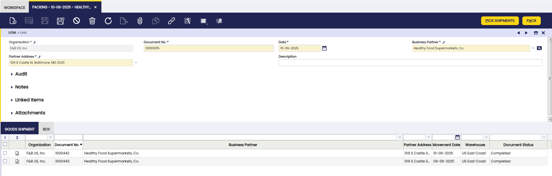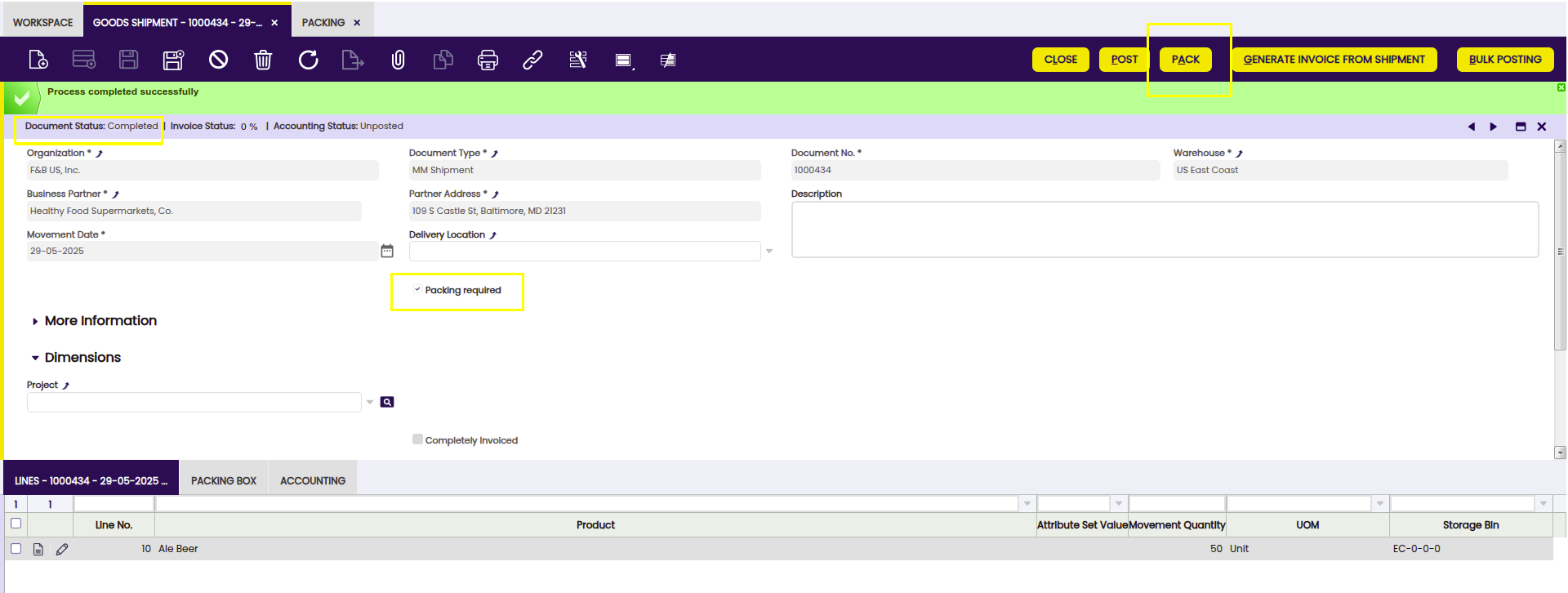 In case the process is initiated from the Goods Shipment window, the document must have a status of Completed, and the Packing Required field must be selected. Once these conditions are met, the Pack button becomes available, allowing the user to proceed with packing the products.