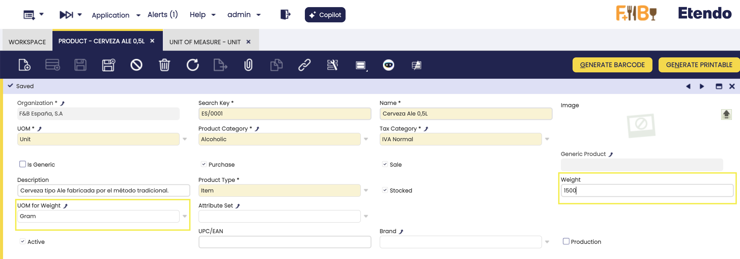 Product window: Here it is possible to define the weight and the unit of measure (UoM) for the product.