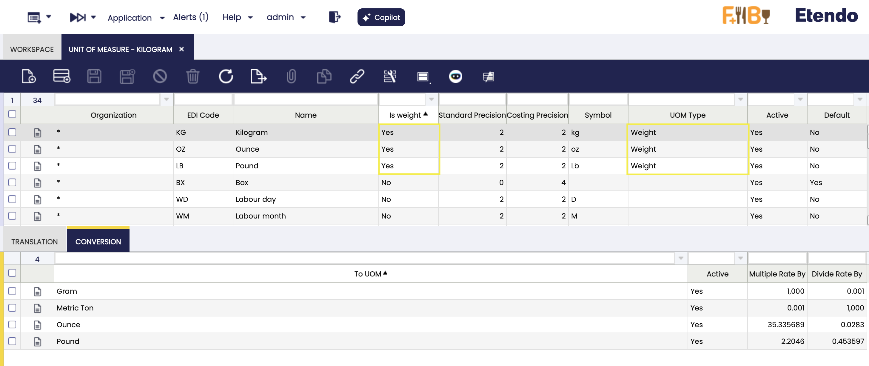 Unit of Measure window: This module adds a new field Is weight. In this window, also it is possible to define the Conversion between UOM, that is, between the UOM of the product and the UOM of the box.