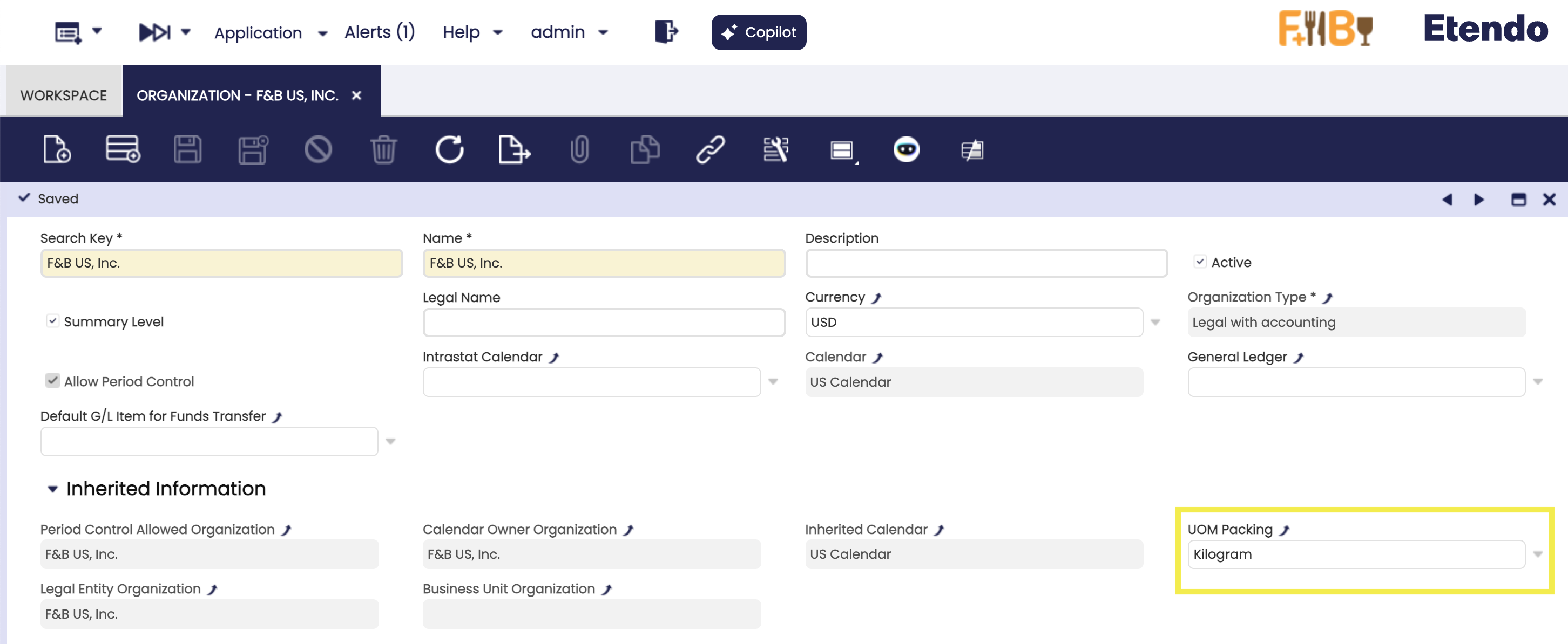 Organization window: This module adds a new field UOM Packing. This UOM is the default one for every box. This is needed to make the conversion between the UOM Packing of the Product and the UOM Packing of the box.