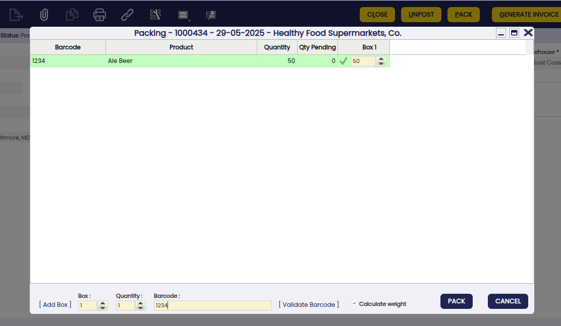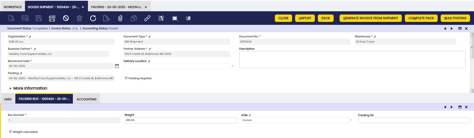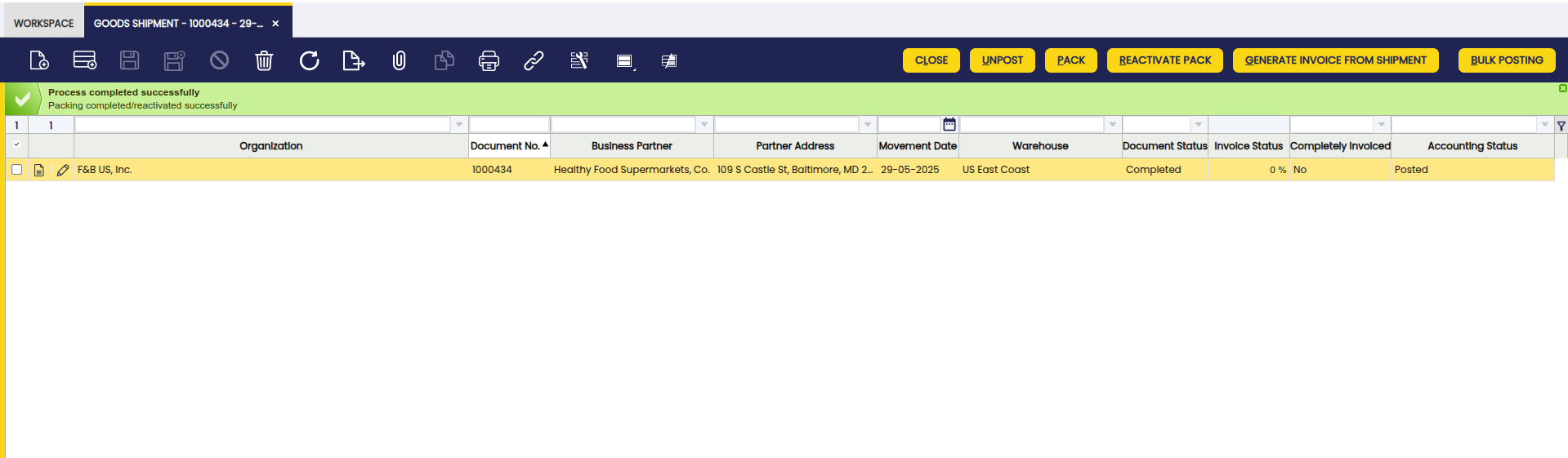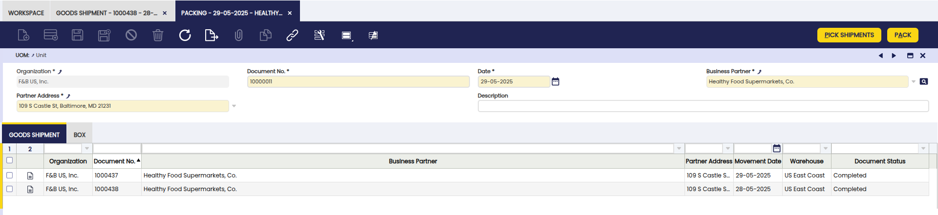 Whether the process is started from one the Goods Shipment or the Packing window, one record is created in the Packing window. So, this is a centralized window where it is possible to check all packs done and complete the packing process.