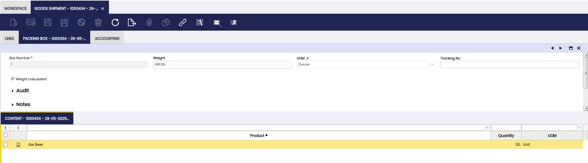 Once all boxes and their content have been created, press the button Complete Pack. The information of the boxes such as the weight, UOM and Tracking No. cannot be edited. This button completes all boxes at once. This button is present in both, the Goods Shipment and the Packing window.