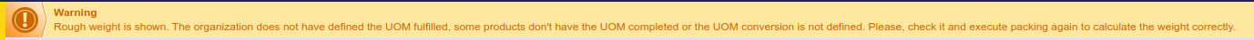 If the above message is shown, the UOM must be configured in both the Organization and in each product. Even if each product has a UOM configured, when packing it will take the UOM defined in the Organization and the corresponding conversions will be made if necessary.