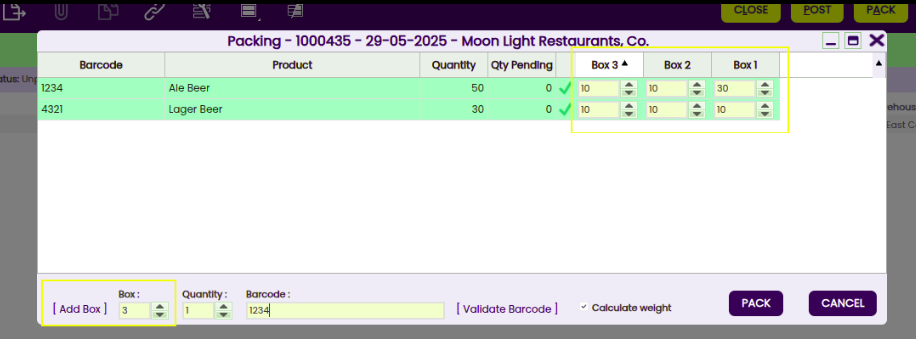 Once all the products have been validated in their corresponding boxes, the process is completed by clicking on the Pack button.