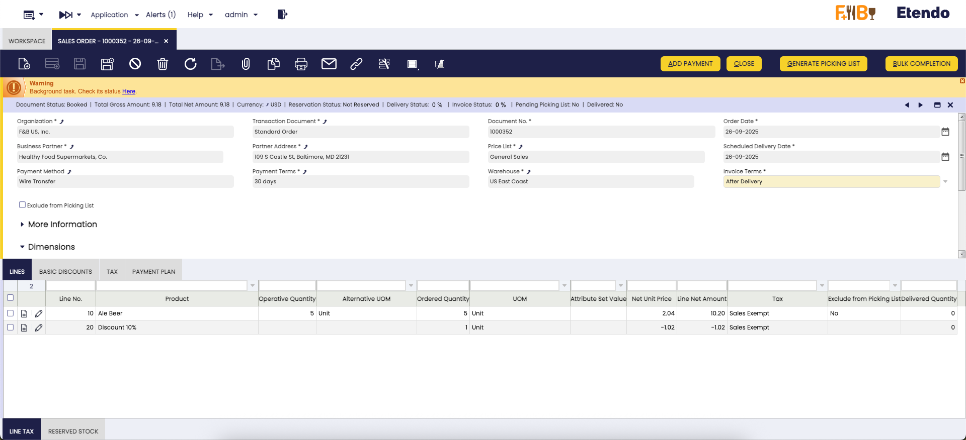 Picking Lists can be generated by the Generate Picking List button available in the Sales Order window and/ or created manually from the Warehouse Picking List window. In both cases the user has to select the Sales Orders to be included in the Picking List. The sales order needs to be Booked and pending to be shipped, that is, the delivery status must be below 100%.
