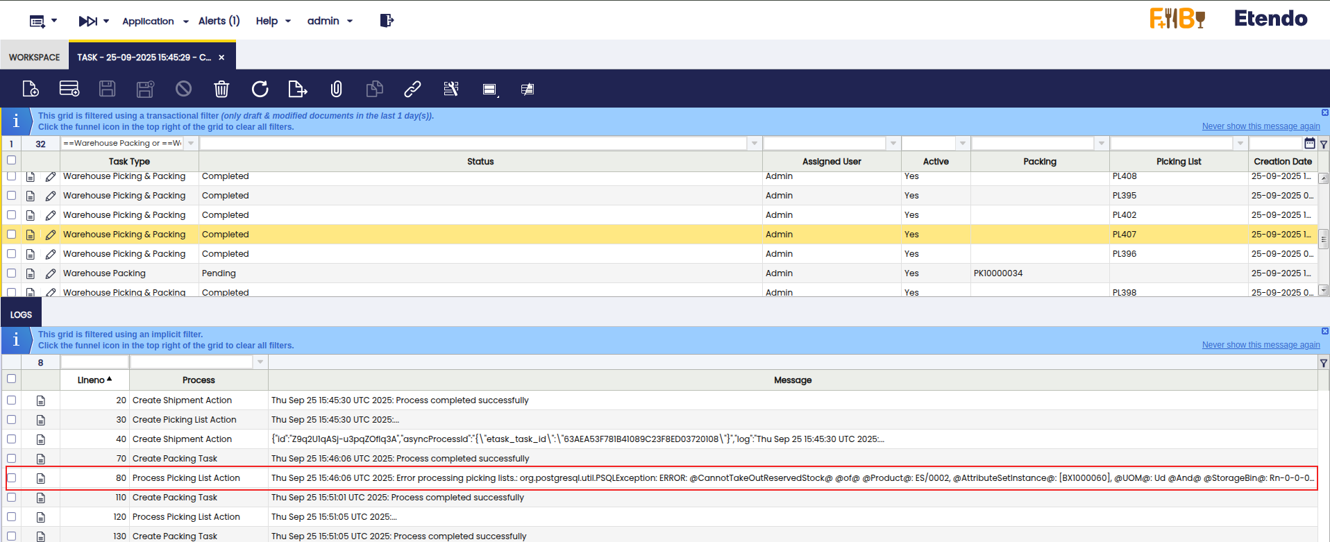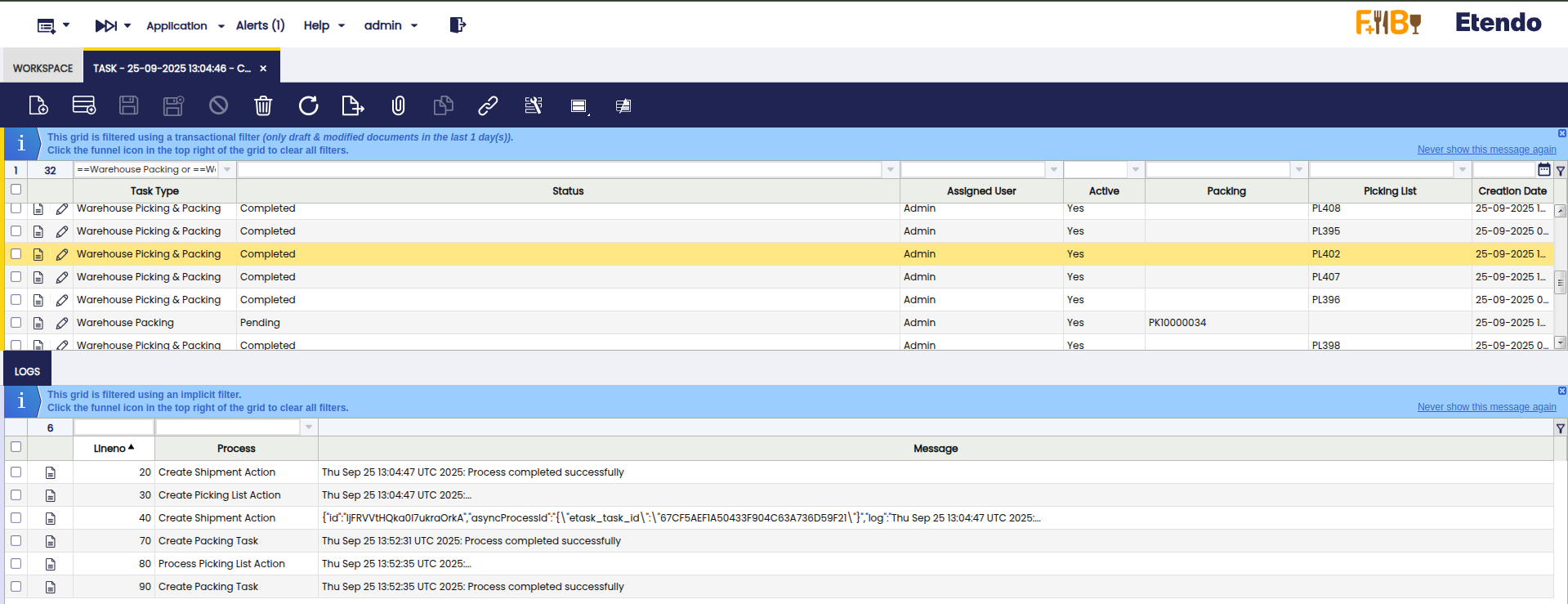 In order to provide greater visibility, the system displays a warning message at different stages of the process, that includes a link to the Task window. From there, the user can check the details of each process executed and review the corresponding logs, ensuring better control over the correct completion of operations.