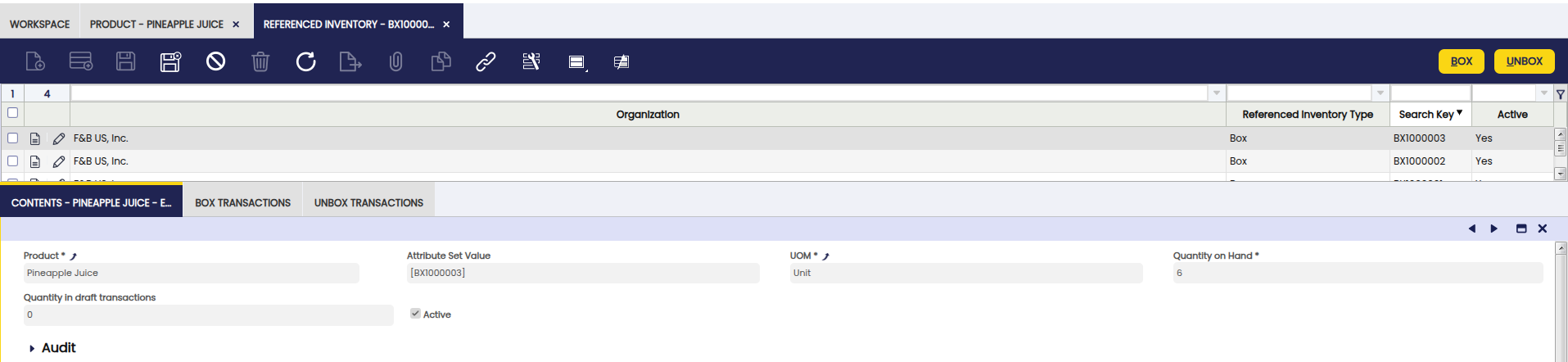 A pallet with boxes of pineapple juice is received. The receipt is made from the Goods Receipt window. Once the receipt is complete, the user must manually enter the Referenced Inventory window to create a box for each box received. Then, a new Pallet-type Referenced Inventory must be created and the previously created boxes must be associated with it. In this way, the product stock shows a Pallet whose contents are composed of boxes, rather than individual units of the product.