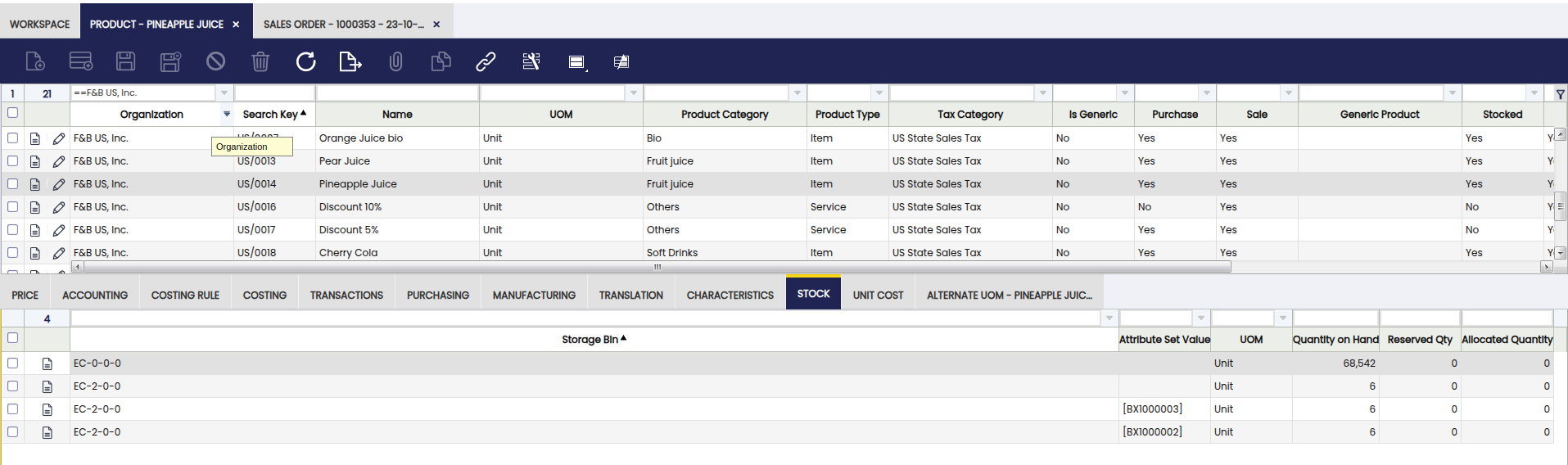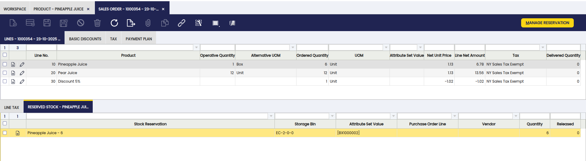 In the Sales Order, the user can select the product and define the alternative unit (AUOM) in which they wish to make the sale, such as a box or a pallet. This is where the module's reservation logic comes into play.