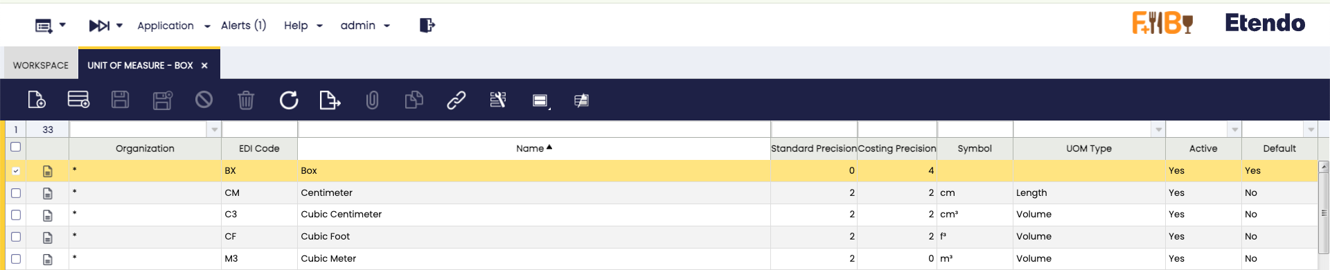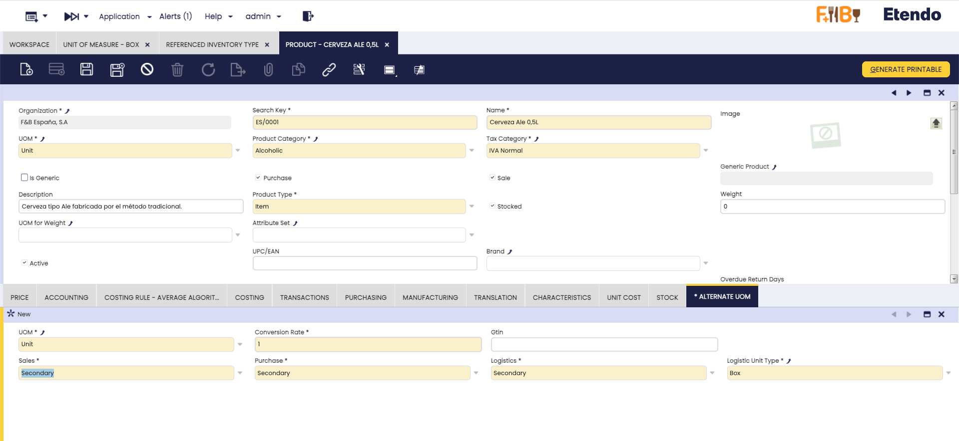In the Unit of Measure window, the module adds the units of measure Box and Palets to facilitate the management of logistics units within the system. These UOM serve as the basis for configuring products with alternative units, while the user can create as many additional variants as needed based on the different box format used.