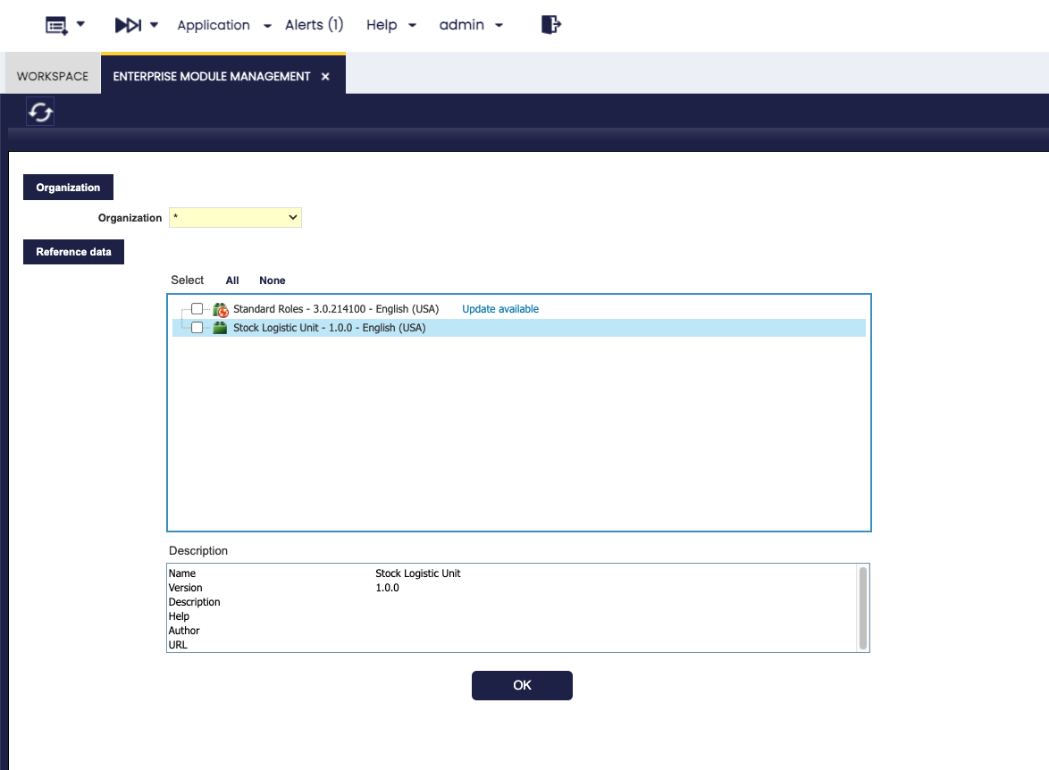 Open the Enterprise Module Management window and install the Stock Logistic Unit reference data included in the module; this will create the units of measure and the reference inventory types Box and Pallet.