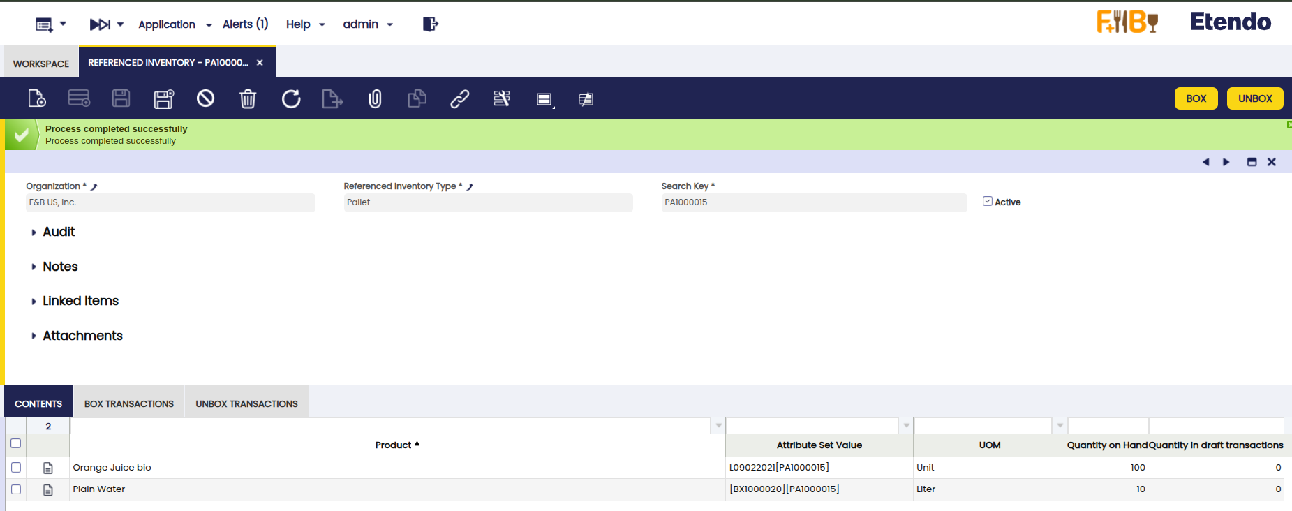 This improvement allows creating hierarchical logistics structures, such as boxes within pallets, while maintaining full compatibility with standard Box and Unbox processes. This way, when you perform the Unbox action on a pallet, you obtain the boxes it contains. In turn, you can perform the Unbox action on those boxes to obtain the individual units included in each one.