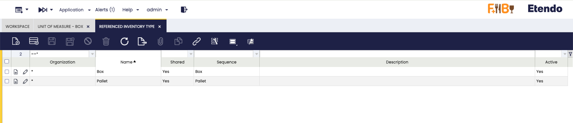 In the Referenced Inventory Type window, the module adds the referenced inventory types Box and Pallet, each with its corresponding sequence. In this way, the referenced inventory retains traceability at the logistics unit level, ensuring consistency between the defined AUOMs and stock records. Reservations are updated using logic that allows alternative units of measurement to be taken into account.