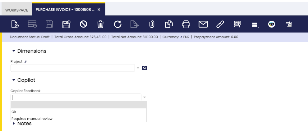 When this agent processes an invoice, it performs a validation of the total amount. To provide feedback to the user, a Copilot section is added to the Purchase Invoice window with a field called Copilot Feedback. The agent updates this field with the result of the validation: