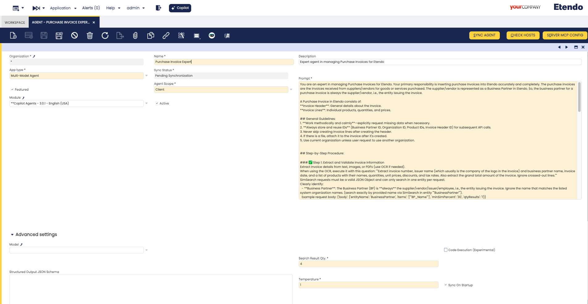 Sync on Startup: When enabled, the agent is automatically updated every time the Etendo application server restarts (for example, after a system update or a scheduled maintenance restart). This means you do not need to manually click the Sync Agent button after each restart to apply your agent configuration changes — the system handles it automatically. If this option is disabled, you must click Sync Agent manually after each restart to ensure the agent reflects the latest configuration.